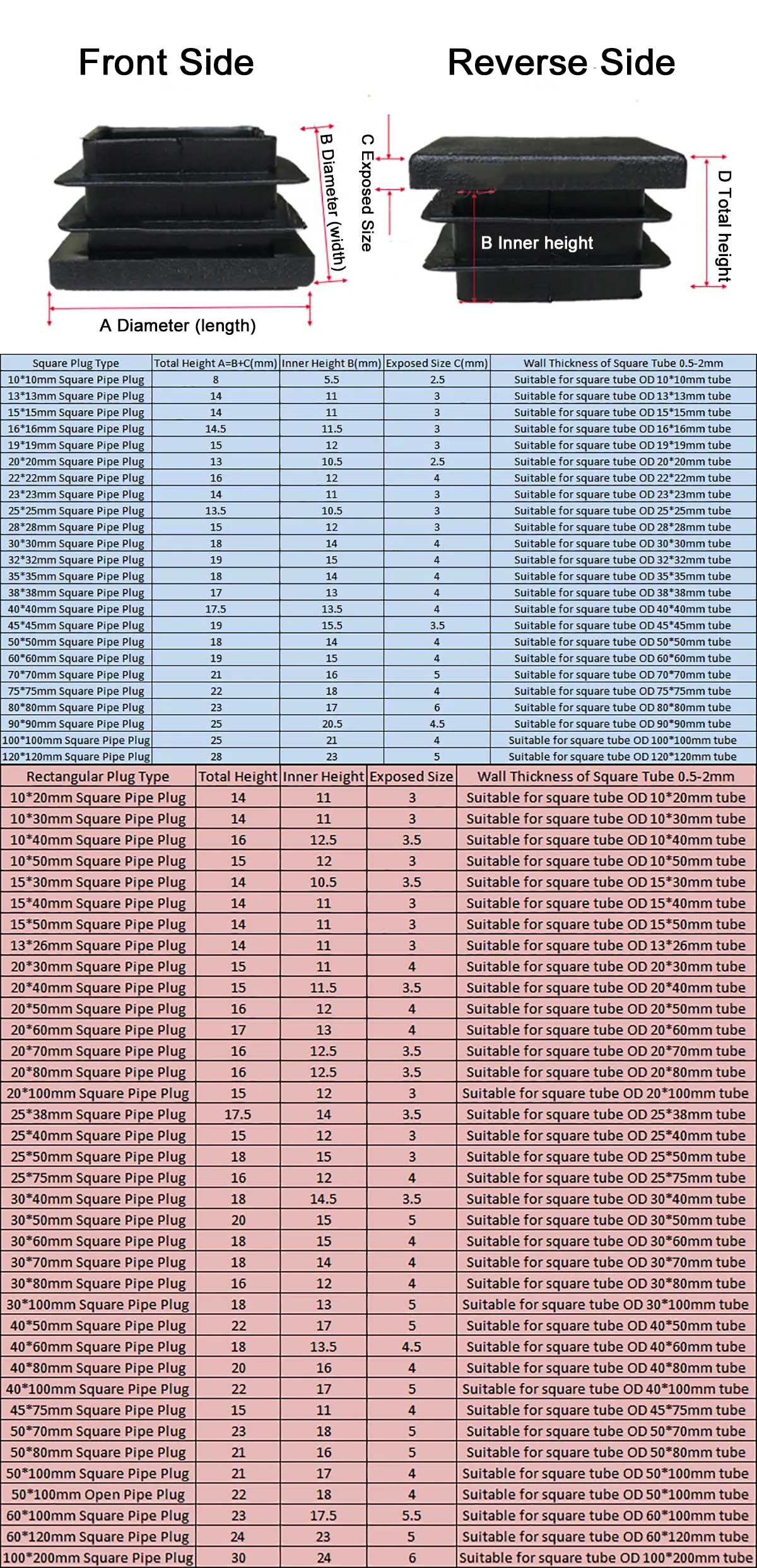 Les bouchons de tube carrés en plastique PE sont des produits de haute qualité, fabriqués à partir de plastique PE durable. Ils sont disponibles en différentes tailles, notamment 30×30, 38×38, 40×40, 50×50 et 60x60mm, pour s’adapter à tous types de pieds de chaise.