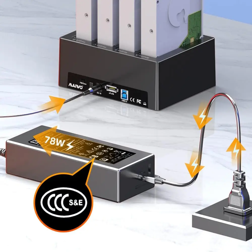 | Compatibilité | Cette station d’accueil pour disque dur à 4 baies est compatible avec tous les disques durs SSD SATA I II III de 2.5/3.5 pouces. Prise en charge de la lecture et de l’écriture et de la fonction 1 à 3 clones. |
