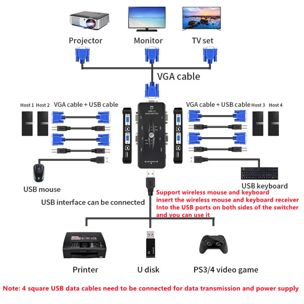 Ce commutateur KVM prend en charge les périphériques USB tels que clavier, souris, adaptateur de moniteur, etc.